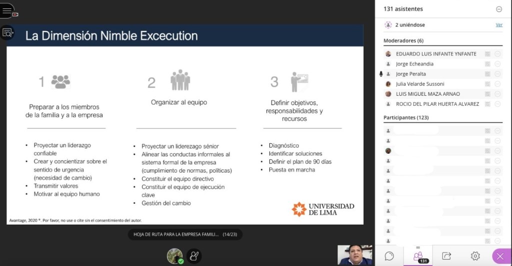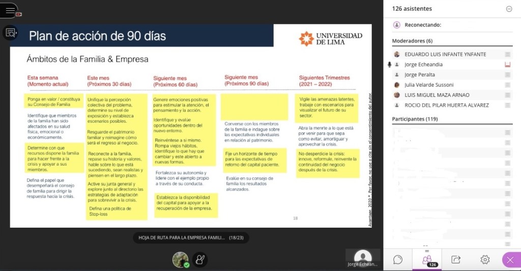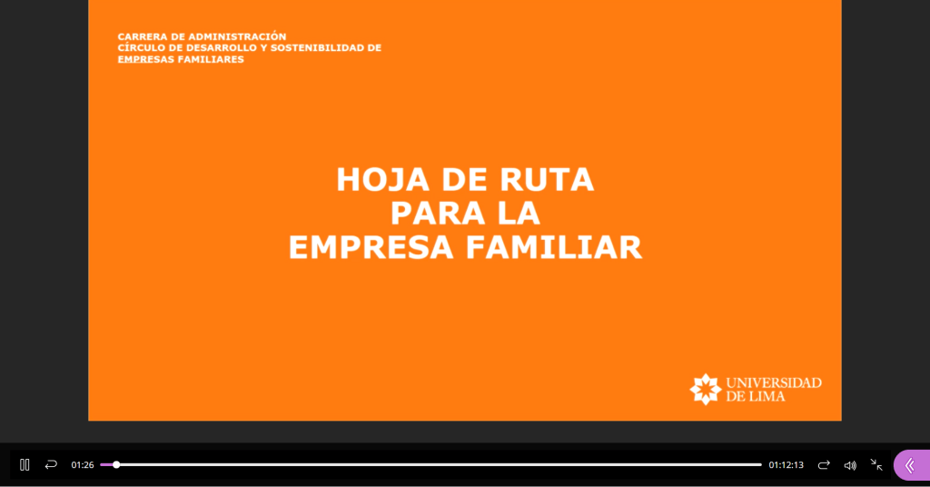 El día 24 de setiembre del 2020 el Círculo de Desarrollo y Sostenibilidad de Empresas Familiares de la Carrera de Administración de la Universidad de Lima organizó el webinar Hoja de Ruta para la Empresa Familiar